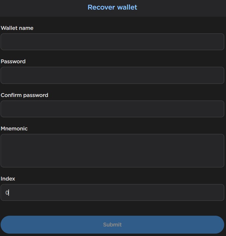 To set up an existing account, select this option and enter the mnemonic key and wallet’s password.