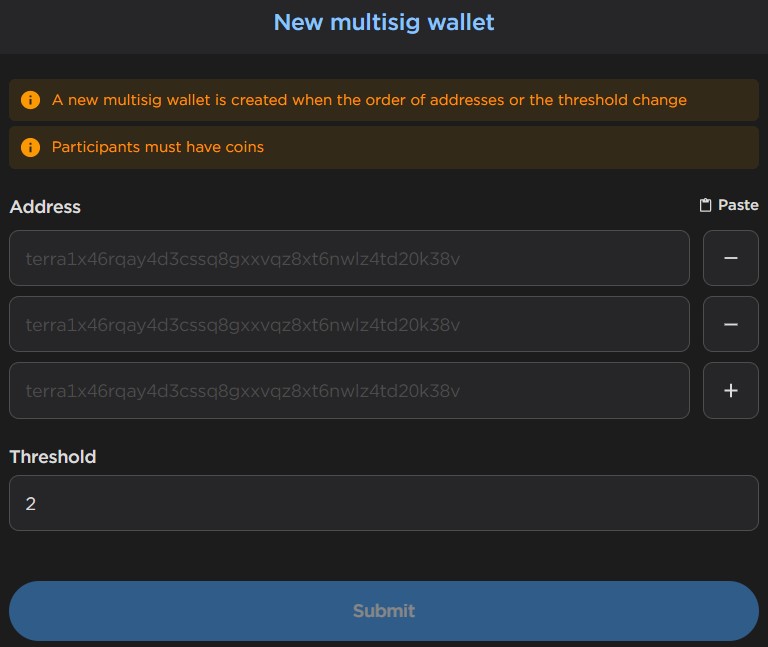 The Terra Station wallet application allows you to create a multisig wallet. As the name implies, it is a wallet that requires multiple signatures to sign a transaction. And multiple signatures mean more than one party is involved.