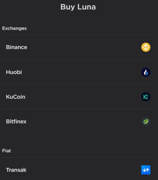 LUNA is the native protocol token that is used for staking, governance, and mining. Users can get the LUNA token from any of the below platforms. Check the full list of supporting platforms here.