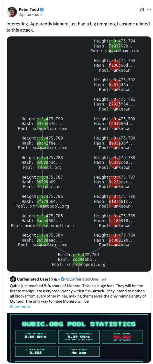 Qubic’s pool peaked at about 52.72% of Monero’s total hashrate, roughly 3.01 gigahashes per second. This was planned to run for a specific period in August.