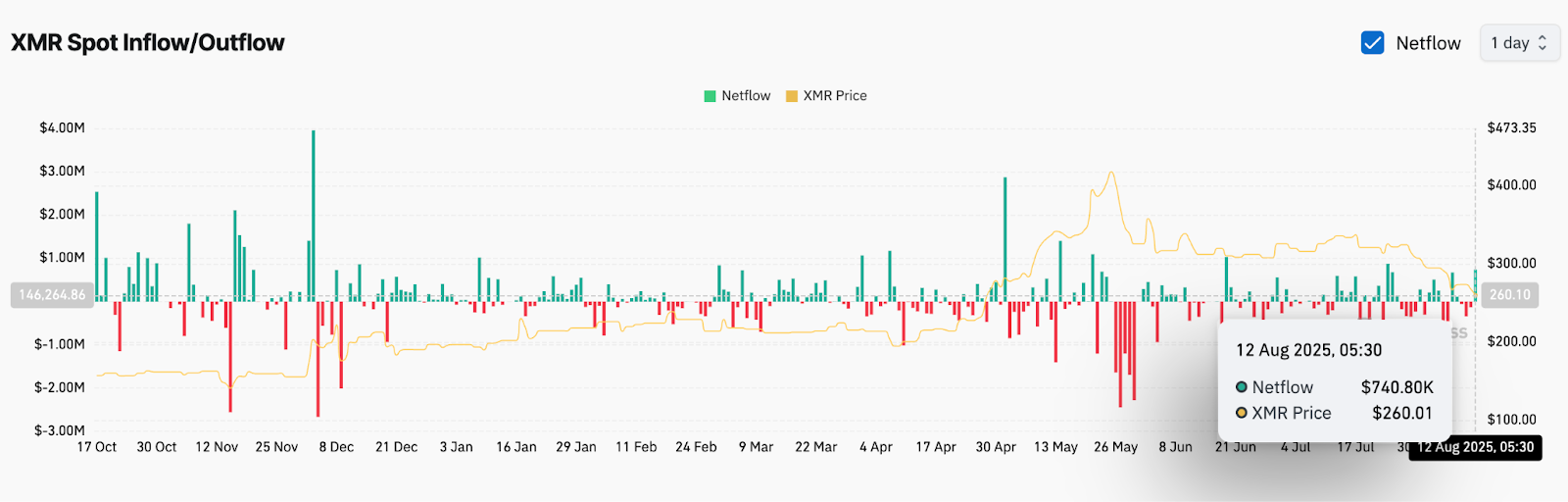 News like this can make traders nervous. One common reaction is moving coins from private wallets to exchanges. This is what the data shows: Monero’s daily exchange net flows turned positive after a run of outflows. Around $740,000 worth of XMR moved onto exchanges.