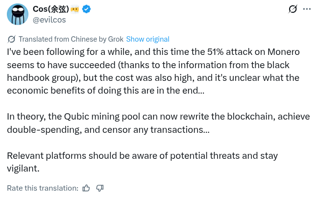 “The cost was also high, and it’s unclear what the economic benefits of doing this are in the end… In theory, the Qubic mining pool can now rewrite the blockchain, achieve double-spending, and censor any transactions.”