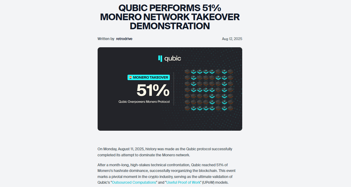 Qubic’s move into majority control of Monero last week sent ripples across the digital asset space, as it proved the real-world vulnerability of proof-of-work blockchains to concentrated hashrate attacks. By amassing majority computing power, Qubic’s mining pool reorganized six blocks on Monero’s network after a month-long struggle with existing miners. The attack did not alter Monero’s fundamental privacy or usability, but it raised immediate concerns about the security of one of crypto’s most resilient privacy-focused blockchains.
