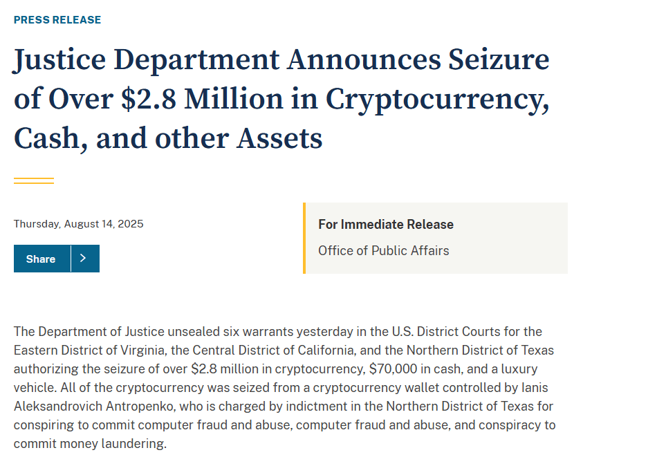 The US is also fighting for crypto control, but in this case from a ransomware operator. The US Justice Department seized more than $2.8 million in cryptocurrency, alongside cash and luxury assets, in a criminal case tied to an alleged ransomware operator.