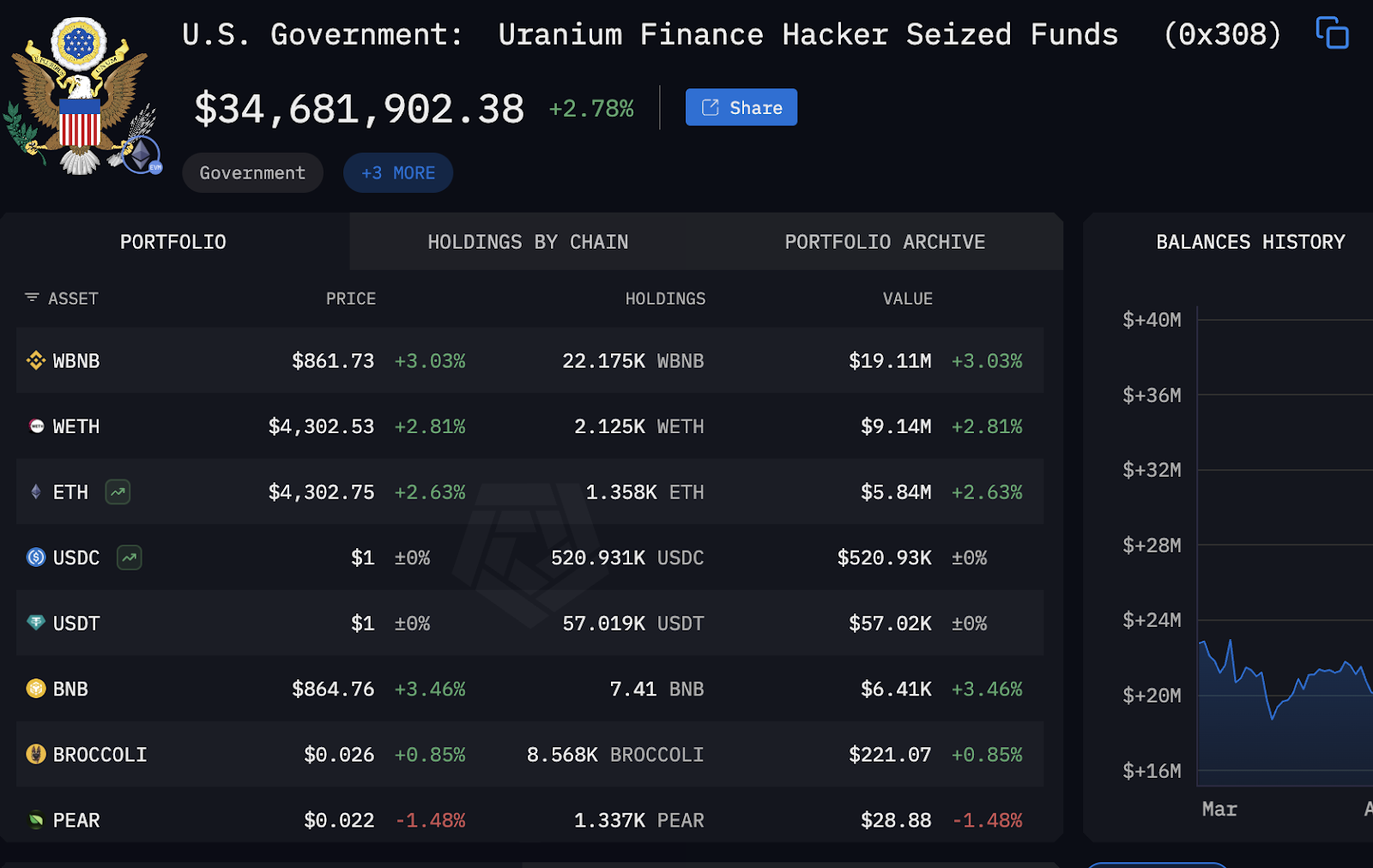 A U.S. government crypto wallet for assets seized in the Uranium Finance exploit has received an additional $332,000 in Ethereum. The inflow comes months after officials said they recovered $31 million assets in connection with the 2021 hack.