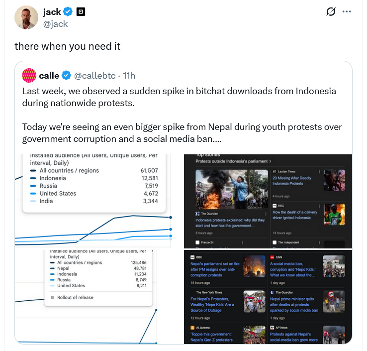 “Last week, we observed a sudden spike in bitchat downloads from Indonesia during nationwide protests. Today we’re seeing an even bigger spike from Nepal during youth protests over government corruption and a social media ban,” callebtc posted to X on Wednesday.