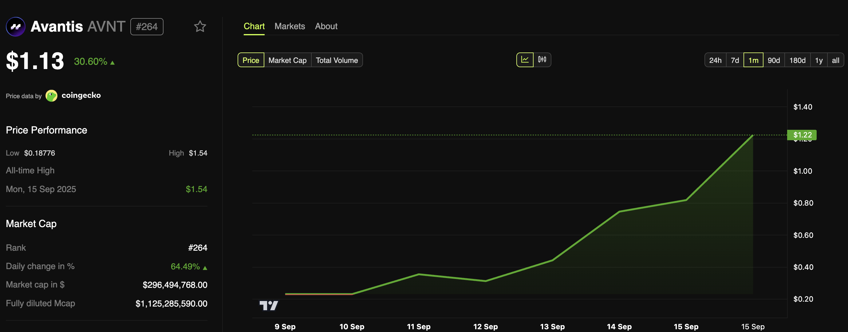 The listings sparked a sharp rally, pushing AVNT’s price above $1 and driving it to a new all-time high (ATH) of $1.54 yesterday. Moreover, momentum has continued.