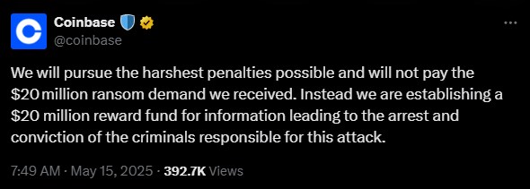CEO Brian Armstrong stated that the attackers attempted to extort $20 million in Bitcoin.