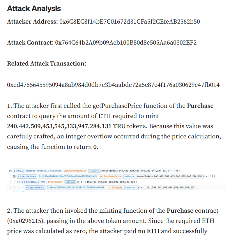 “Due to a lack of overflow protection in an integer addition operation, the Purchase contract of Truebit Protocol produced an incorrect result when calculating the amount of ETH required to mint TRU tokens,” SlowMist said.