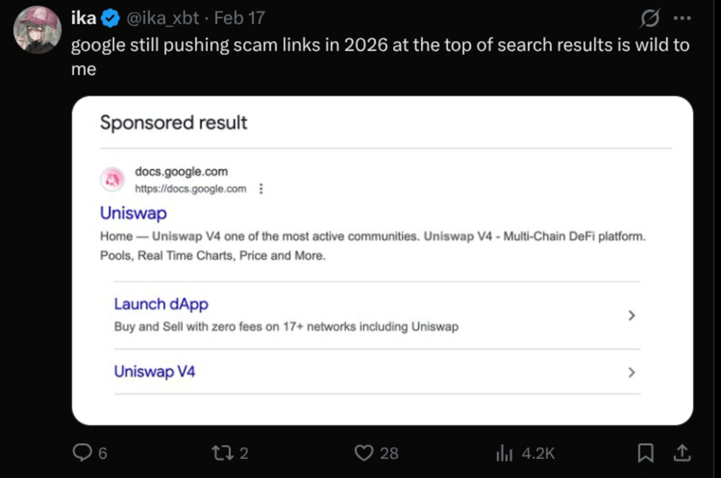 DefiLlama’s founder disseminated the case as a warning to the community. Uniswap creator Hayden Adams echoed the message, calling the situation “horrible” and noting they have fought these types of frauds for years. Adams pointed directly at the industry of fake advertisements that mimic legitimate platforms and stated that “the ad economy needs to go.“