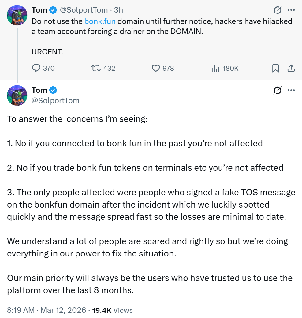 In a follow-up post, Tom said the exploit targeted users who signed a fraudulent terms-of-service prompt that appeared on the site during the breach. Users who had previously connected wallets to Bonk.fun were not affected, and traders interacting with Bonk-related tokens through external terminals were also safe.
