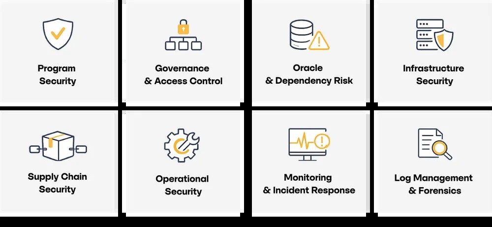 According to an official report, the program measures protocols across eight pillars, including program security, governance, oracle and dependency risk, infrastructure, supply chain security, operational security, monitoring, incident response, and forensics. That structure expands security checks beyond code alone.