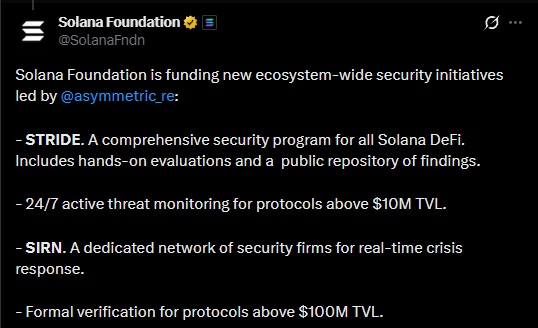 The Solana Foundation announced the launch of STRIDE (Solana Trust, Resilience and Infrastructure for DeFi Enterprises), a continuous security evaluation program aimed at all DeFi protocols built on the network.