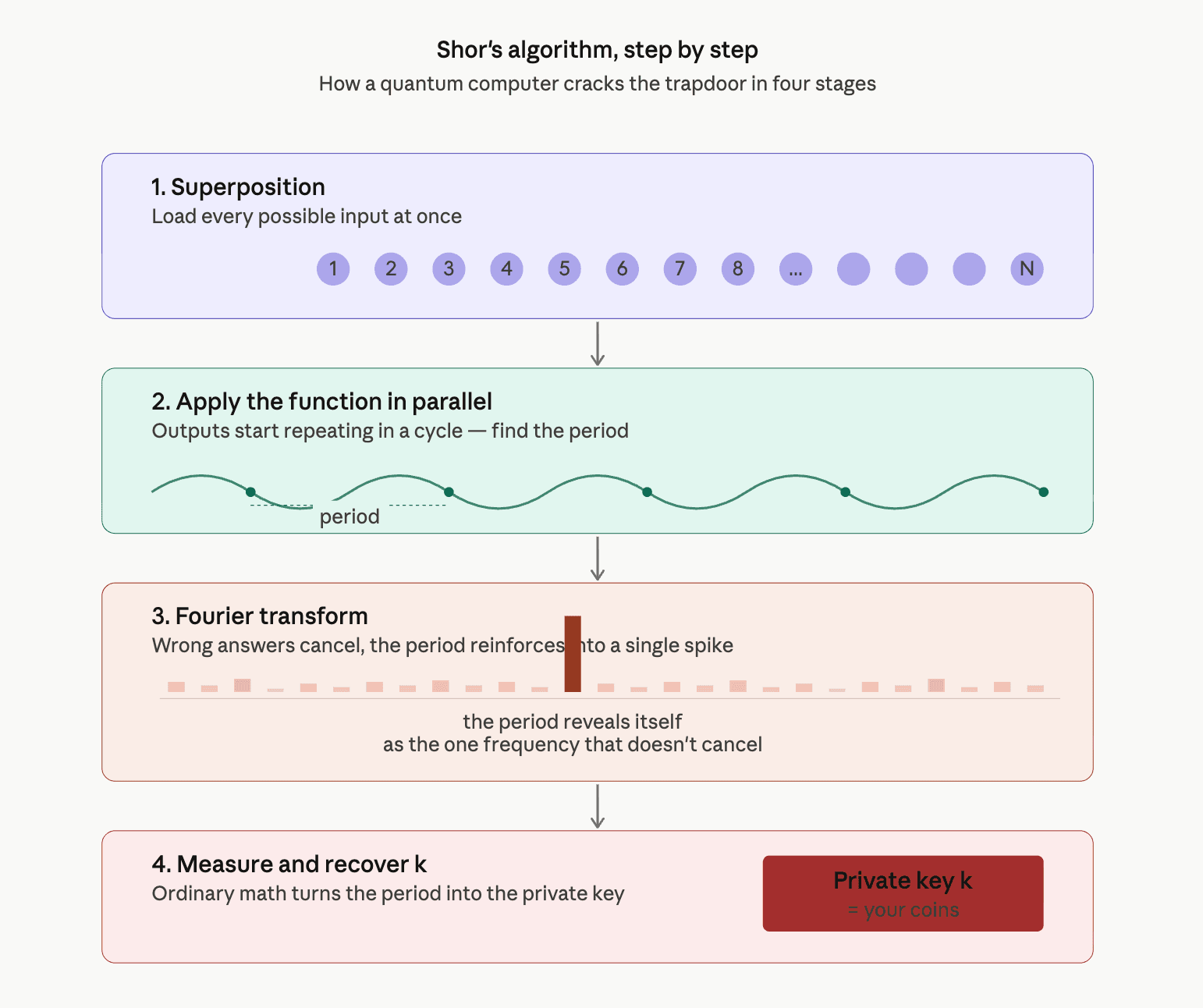 When you measure the result, the period appears. From this period, ordinary math recovers k. That is your private key, and therefore your coins.