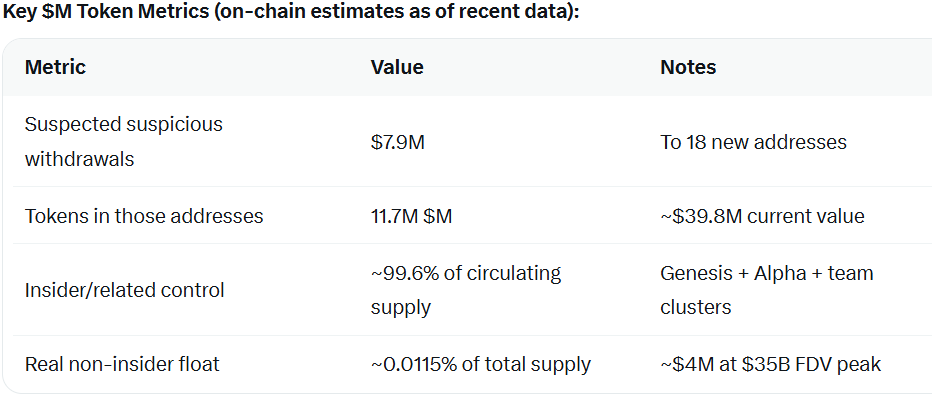 The most notable of these were $7.9 million in questionable transactions from Kraken to 18 newly created addresses soon after listing. These accounts owned 11.7 million $M coins valued at approximately $39.8 million.