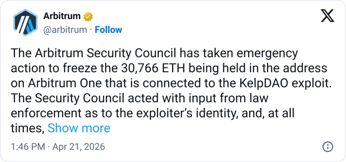 Arbitrum said on Monday that its security council, a 12-member body elected by the Arbitrum community, took “emergency action” to freeze 30,766 Ether ($ETH) that was held in a wallet connected to the Kelp exploit.