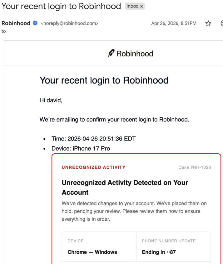 Robinhood users on Sunday began reporting on social media of emails originating from the platform's mail server warning of an unrecognized device login, which linked to phishing websites in the "call to action" button.
