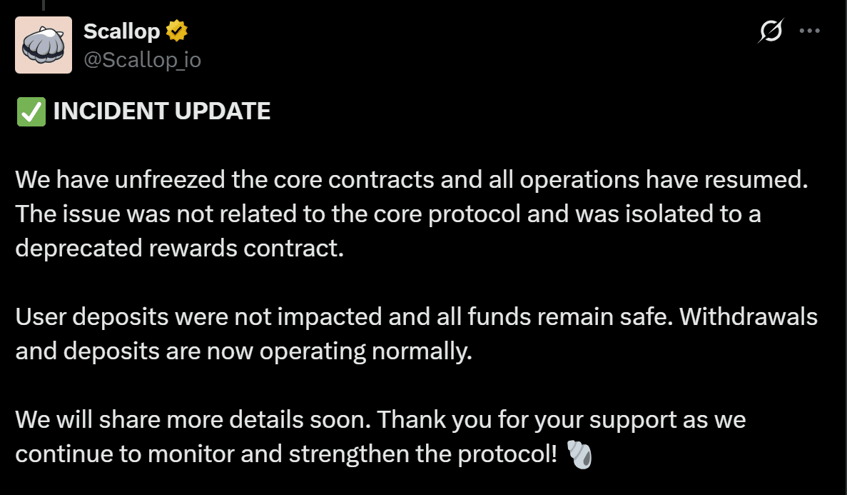 Following the exploit, Scallop restored operations, signaling a controlled recovery rather than systemic failure. Core contracts resumed as the issue remained isolated to a deprecated rewards module.