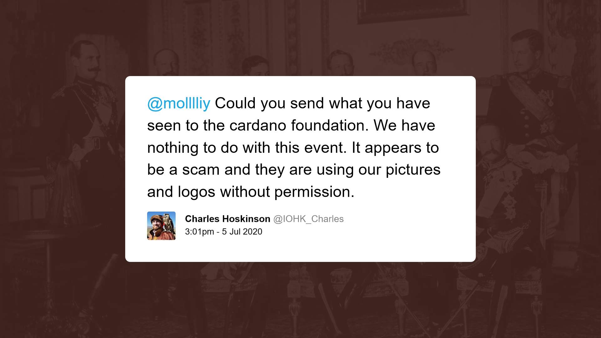“You work five years on something, you put your heart and soul into it, you just have a giant event with 10,000 people attend, and you see floating around Telegram, Twitter, many channels, some video, some scammers in China using my face, our company’s logo, the Cardano Foundation’s logo who have absolutely no affiliation with us.”