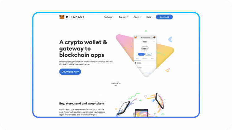 MetaMask is a hot wallet that allows you to store, send, and receive Ethereum and ERC20 tokens. It’s available as a browser extension for Chrome, Firefox, Opera, and Brave. Metamask allows you to buy ERC-20 tokens right through the app and gives you control of your private key, making it non-custodial. It’s also open-source, which may be used with various customizable chains like Binance Smart Chain and layer two technologies like Polygon. Metamask allows its users greater control over their public and private keys. Finally, due to Metamask’s appeal and sizable developer community, it can currently connect with most decentralized applications.