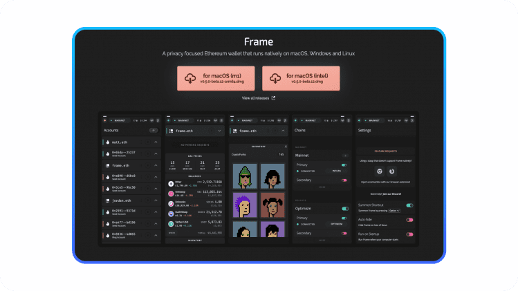 Frame Wallet is a secure software explicitly designed for macOS, Windows, and Linux. It has a hot wallet that may be used as a desktop and web wallet. Some features are quite unusual, such as checking names on Twitter using the extension or displaying gasoline on the menu bar. It’s simpler to move things across active chains with its easy-to-use interface and seamless appearance.