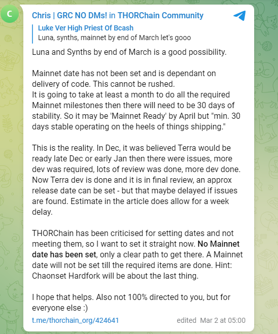 Further highlights that Thorchain has been criticized for just setting dates and not acting on them, so he wants to get it straight now. He clearly specified that No Mainnet Date had been set, only a clear path to get there. And that a Mainnet date would not be set until the required items are done.