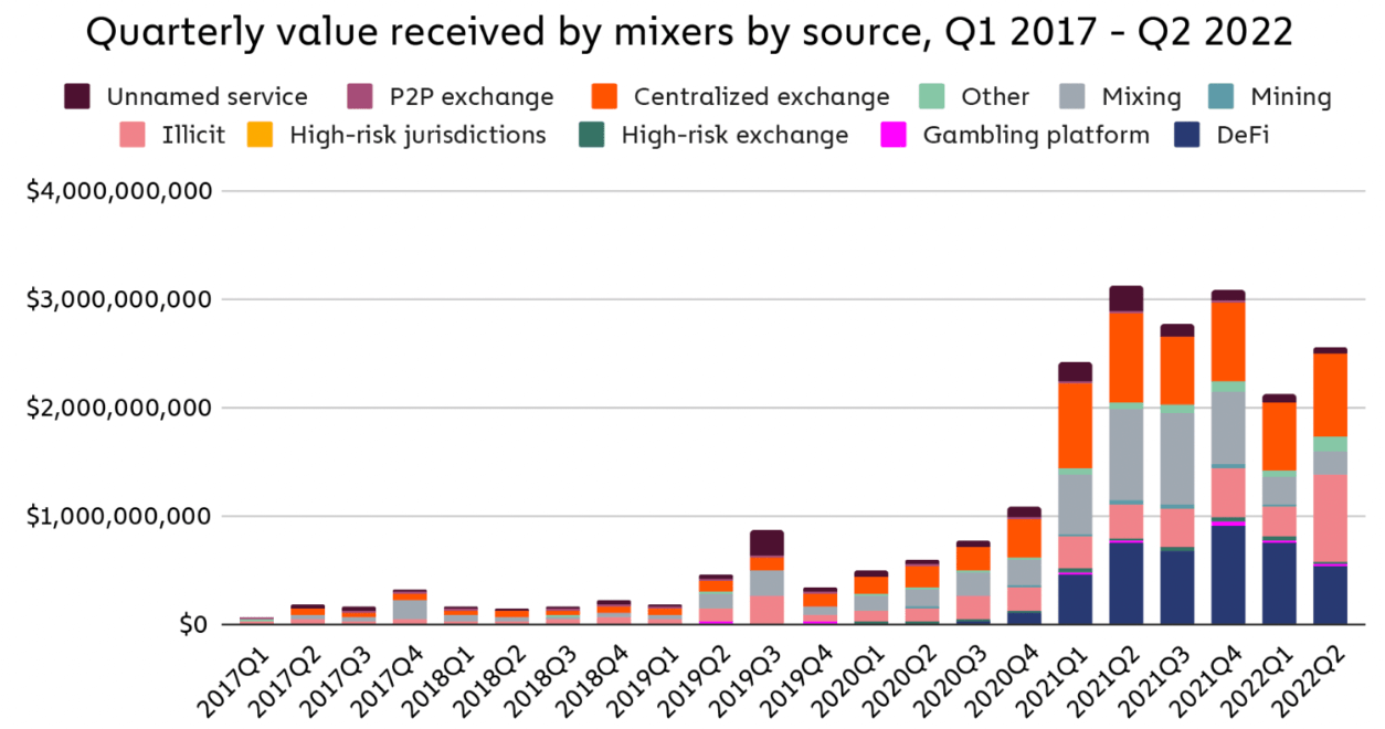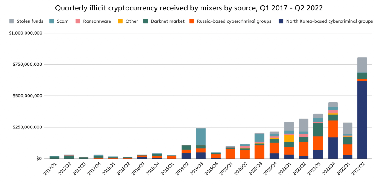 Crypto mixer usage reached an all-time high in 2022 with a significant contribution from sanctioned entities and cybercriminals with known state affiliations, according to Chainalysis‘ recent report.