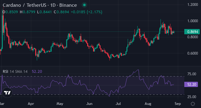 Cardano торгуется в диапазоне $0,83–0,98 после снижения на 1,02% за неделю. Коррекция лишь слегка поддержала рост в 10,10% за месяц и 37,97% за последние шесть месяцев. Покупатели продолжают подталкивать цену к верхней границе диапазона, но пока не смогли преодолеть уровень $1,00.