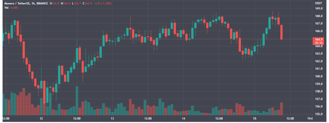 На фоне обновления цена XMR выросла с уровней около $158 до отметок выше $168. На момент написания монета торгуется в районе $165.