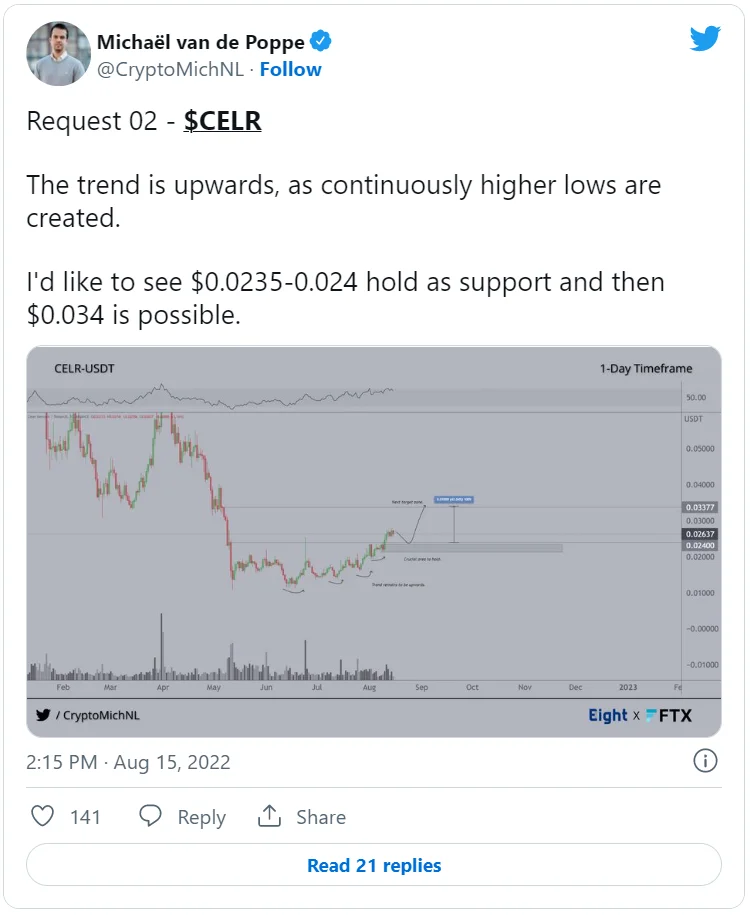 CELR. Также в поле зрения ван де Поппе попал токен решения второго уровня в сети Ethereum (L2) Celer Network. По его мнению, альткоин находится «в очевидном восходящем тренде», поскольку устанавливает более высокие минимумы. По оценкам аналитика, монета может вырасти еще на 30%, до $0,034. В качестве уровня поддержки аналитик выделил диапазон $0,0235–0,024. На данным момент CELR торгуется по $0,0256, за сутки снизившись на 3,25%.