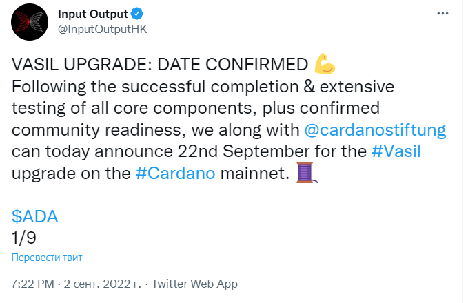 В твите Input Output Global говорится, что Vasil стал самым значительным обновлением в сети Cardano. IOG заявила, что обновление повысит пропускную способность сети и снизит транзакционные издержки.