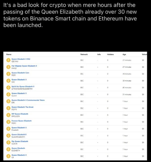 За последние 24 часа на децентрализованных биржах в сетях BNB Chain и Ethereum зарегистрированы пары с монетами вроде Queen Elizabeth Inu, Save the Queen, Queen, QueenDoge, London Bridge is Down и Rip Queen Elizabeth.