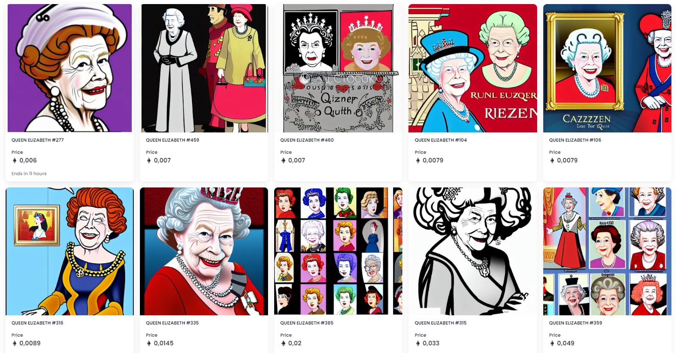 На крупнейшем NFT-маркетплейсе OpenSea появилась коллекция RIP Queen Elizabeth. Каждый из 520 токенов представляет собой неоднозначное изображение покойной королевы.