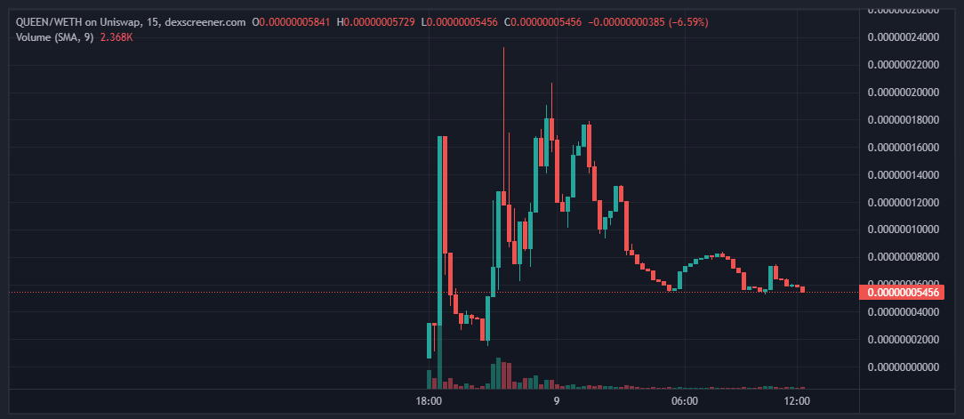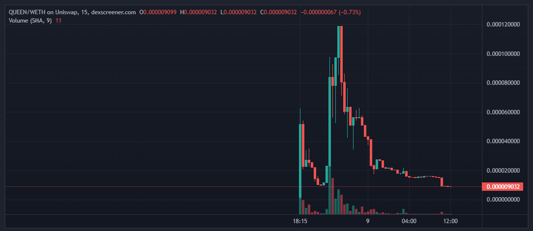 Согласно Dex Screener, объем торгов Queen Elizabeth Inu на Uniswap составил $235 000 при рыночной капитализации монеты в $8900. За сутки токен подорожал на 441%, но торгуется на отметках близких к нулю.