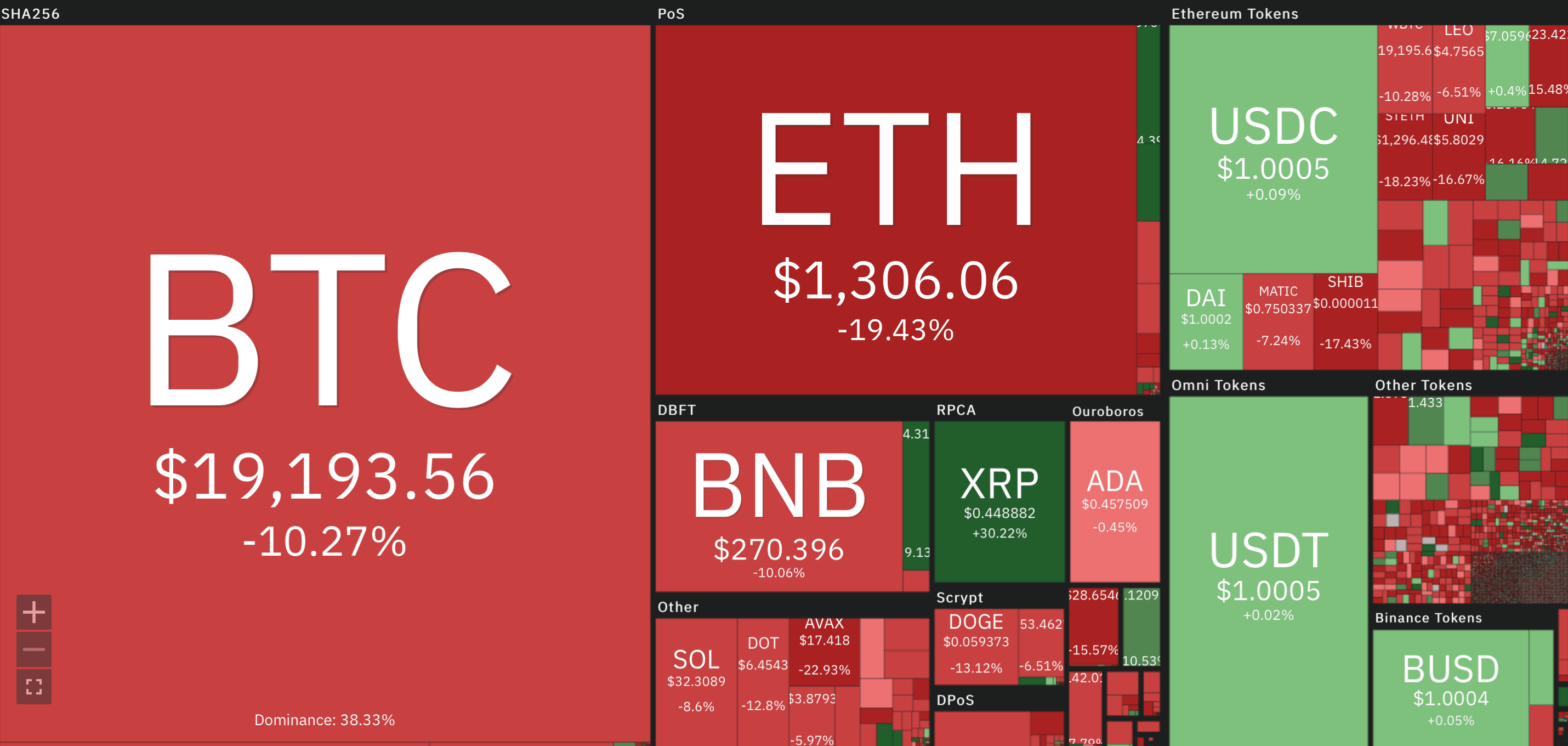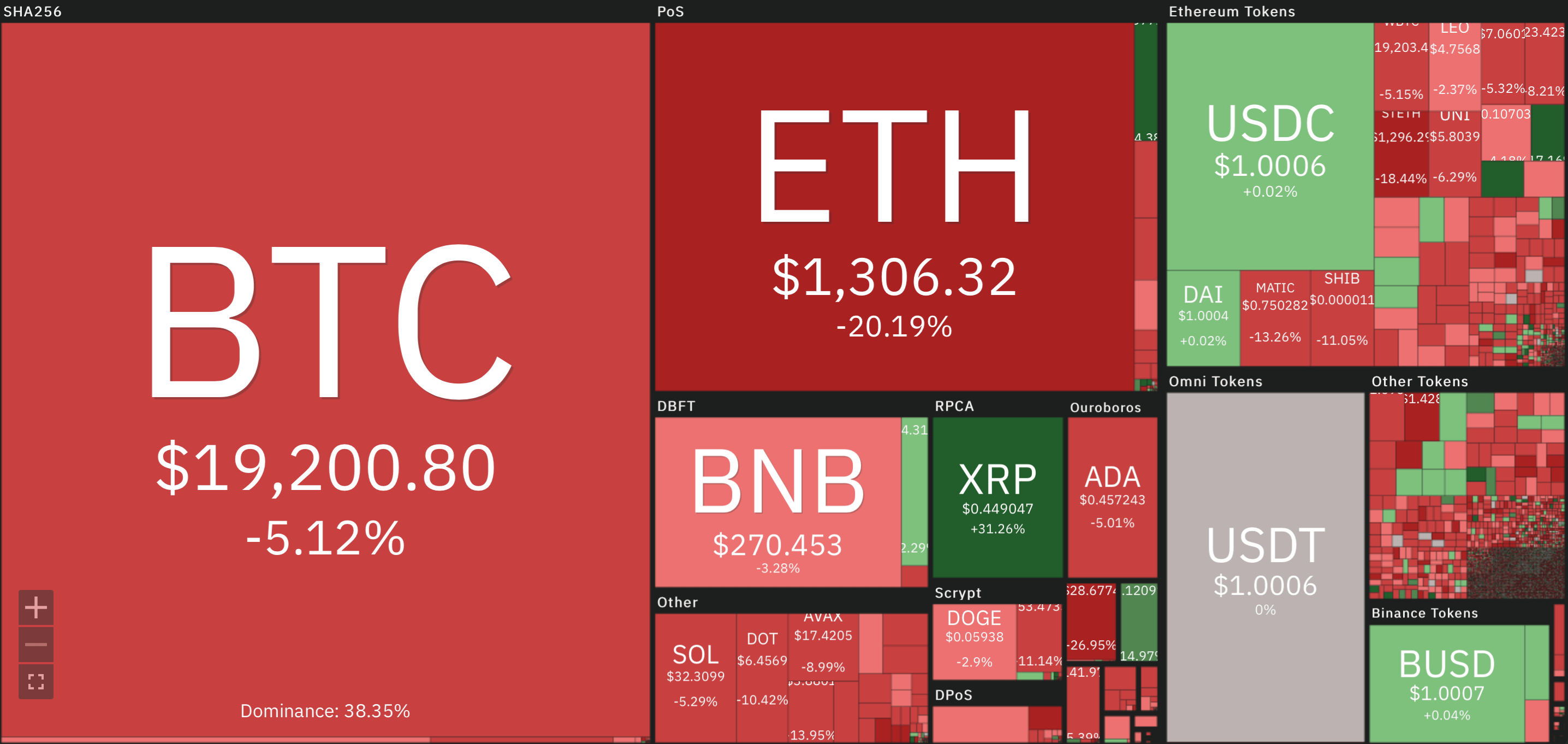 Для демонстрации масштабов последнего достаточно показать, как изменились курсы криптовалют за последнюю неделю. Наиболее ощутимый обвал среди монет с наибольшей рыночной капитализацией здесь показал Эфириум ETH, потерявший 20 процентов цены.