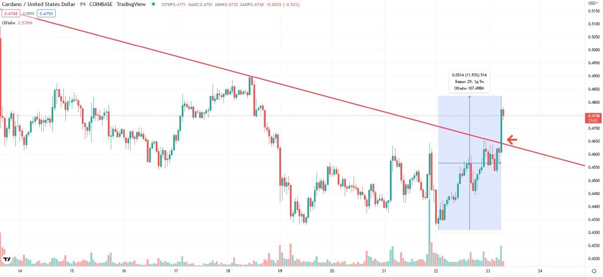 Спустя несколько минут после выхода апдейта на рынке Cardano возник бычий тренд, в результате которого курс криптовалюты вырос почти на 12%. Однако, достигнув пика на отметке $ 0,4824 (на бирже Coinbase), цена монеты начала падать. Вместе с тем в ходе восходящего движения стоимость актива пробила линию медвежьего тренда, стартовавшего 12 сентября. В связи с этим курс ADA может продолжить повышаться в среднесрочной перспективе.