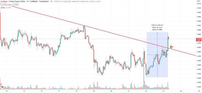 Спустя несколько минут после выхода апдейта на рынке Cardano возник бычий тренд, в результате которого курс криптовалюты вырос почти на 12%. Однако, достигнув пика на отметке $0,4824 (на бирже Coinbase), цена монеты начала падать. Вместе с тем в ходе восходящего движения стоимость актива пробила линию медвежьего тренда, стартовавшего 12 сентября. В связи с этим курс ADA может продолжить повышаться в среднесрочной перспективе.