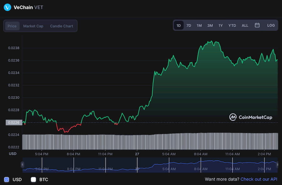 По данным CoinMarketCap, текущая цена VeChain составляет $ 0,02362 при дневном росте в 4,52% и 5,5% за предыдущие семь дней.