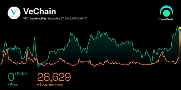 В третьем квартале 2022 года у VeChain наблюдался всплеск упоминаний в социальных сетях, который по состоянию на 27 сентября достиг рекордного максимума за третий квартал. По статистике, предоставленной платформой по анализу криптовалют LunarCrush, недельная активность VET достигла 28 629 упоминаний в социальных сетях.