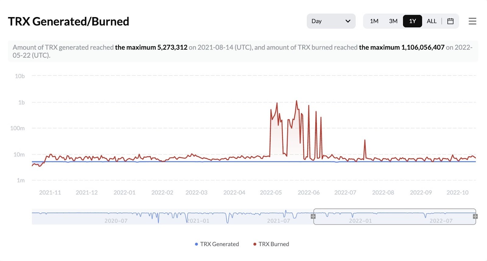 Согласно заявлению, общая сумма токенов TRON в конце этого дефляционного периода достигла 9,6 млрд TRX. Количество сгенерированных TRX достигло максимума 5 273 312 14 августа 2021 года, а количество сожжённых токенов достигло максимума 1 106 056 407 22 мая 2022 года.