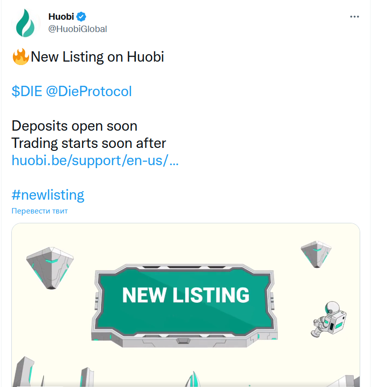 Одной из причин такого энергичного ралли коина стал тот факт, что несколько известных бирж, в том числе Huobi и MEXC, включили его в свои листинги. Также о поддержке $DIE сообщили и менее крупные биржи.