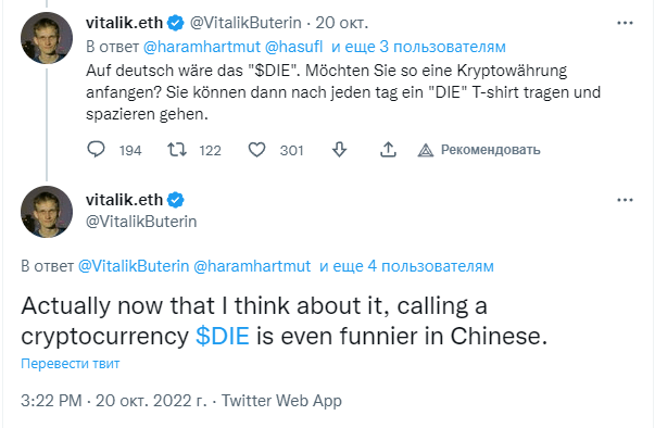 Для тех, кто не в курсе: в переписке Бутерина о немецких подкастах он заметил, что на немецком языке Die означает «The». Он также добавил, что если кто-то запустит такую криптовалюту, он может каждый день носить футболку с надписью «The».