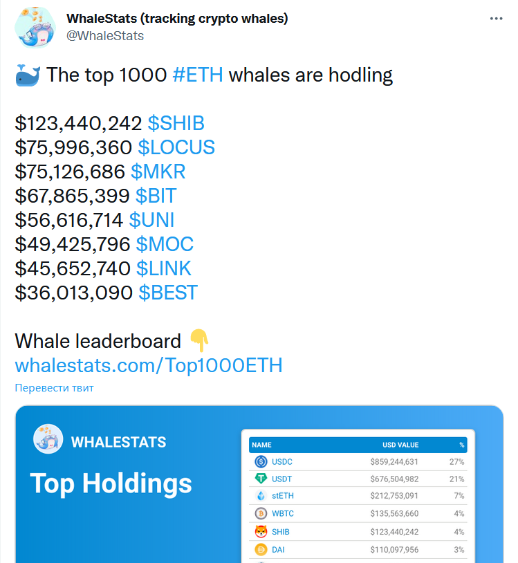 Ощутимую поддержку токен SHIB может получить, если к нему проявят интерес крупные игроки рынка, например, ETH-киты. Интересно, что Shiba Inu продолжает оставаться их любимцев в списке их резервов, согласно данным Whale Stats.