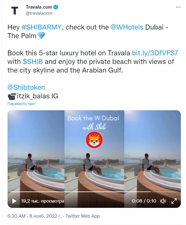 Сайт для планирования туристических поездок Travala, поддерживающий криптовалюту, объявил в Твиттере, что токены Shiba Inu теперь принимаются в качестве способа оплаты в роскошном 5-звёздочном отеле W Hotel’s The Palm в Дубае, принадлежащем Marriott Internation.
