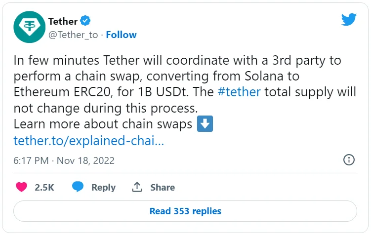Что произошло? Компания Tether заявила о переводе централизованного стейблкоина USDT на сумму 1 млрд долларов из блокчейна Solana в сеть Ethereum. В обмене будет участвовать неназванная третья сторона. Причиной вывода USDT из Solana стала связь блокчейна с обанкротившейся трейдинговой фирмой Сэма Бэнкмана-Фрида, Alameda Research. Согласно заявлению Tether, общее обеспечение компании не изменится после вывода монет в другую сеть.