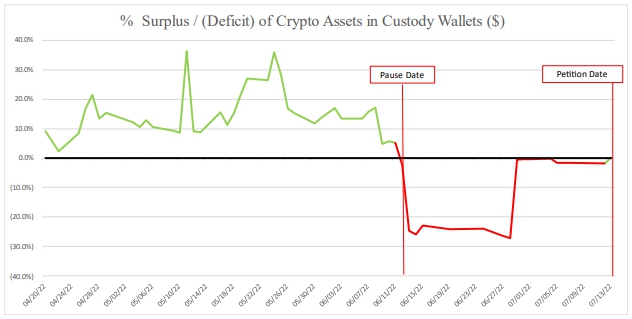 Эксперт также обратил внимание на момент, который, вероятно, вынудил криптолендинговую платформу 13 июня приостановить вывод средств. По его данным, 11 июня клиентские кошельки столкнулись с недофинансированием. К 24 июня дефицит активов вырос на 24% — до $50,5 млн.