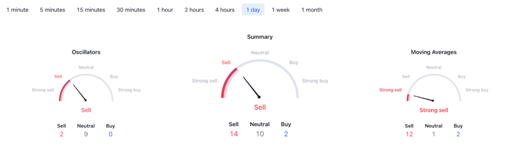 Кроме того, дневной технический анализ Shiba Inu из TradingView остаётся медвежьим, а сводка указывает на продажу с оценкой 14. Скользящие средние рекомендуют «сильную продажу» на уровне 12, в то время как осцилляторы указывают также на «продажу» на уровне 2.