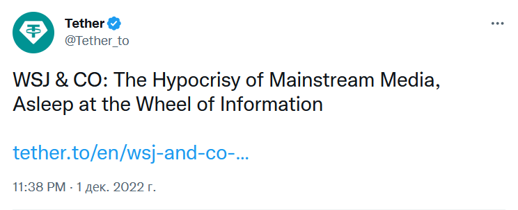 Так эмитент стейблкоина USDT ответил на недавние обвинения Wall Street Journal в том, что компания Tether выдает необеспеченные кредиты