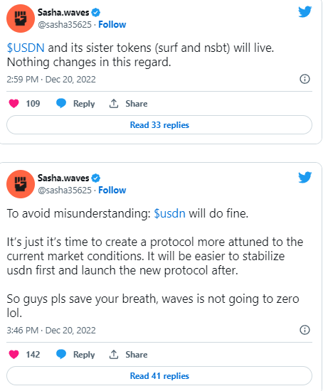 Однако 16 декабря основатель Waves Иванов ответил на этот демарш биржи и заверил пользователей, что их экосистема полностью работоспособна. Более того, она децентрализована, и нет никаких основания для отмены привязки Neutrino. Он добавил, что количество WAVES, заблокированных для выпуска USDN было незначительным и, следовательно, не может повлиять на цену, даже если WAVES будут разблокированы и проданы по рынку.