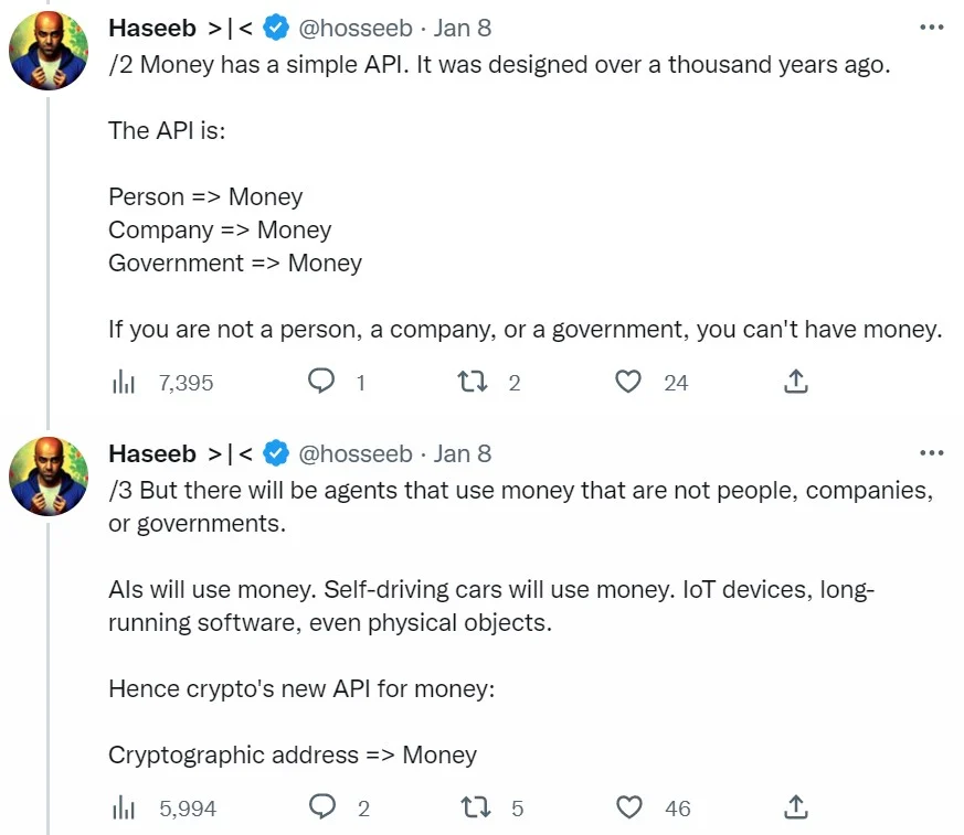 Управляющий партнер Dragonfly Capital Хасиб Куреши считает, что криптовалюта может сыграть большую роль в массовом внедрении ИИ. Особенно это касается тех случаев, когда программное обеспечение, боты и беспилотные автомобили начинают использовать деньги без вмешательства человека, добавил он.